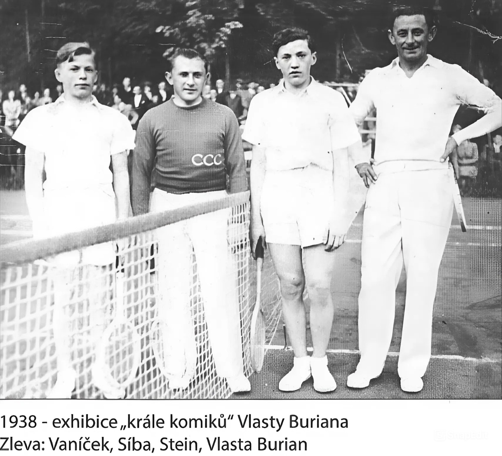 Památná byla i exhibice v roce 1938 - hlavní osobou byl "král komiků" Vlasta Burian, velký sportovec a příznivec tenisu. Partnery mu byli tehdejší přední hráč J. Síba (v 60. letech ústřední trenér) a dva mladoboleslavští dorostenci - Vaníček (po válce nejlepší hráč a později i dlouholetý předseda klubu) a Stein.